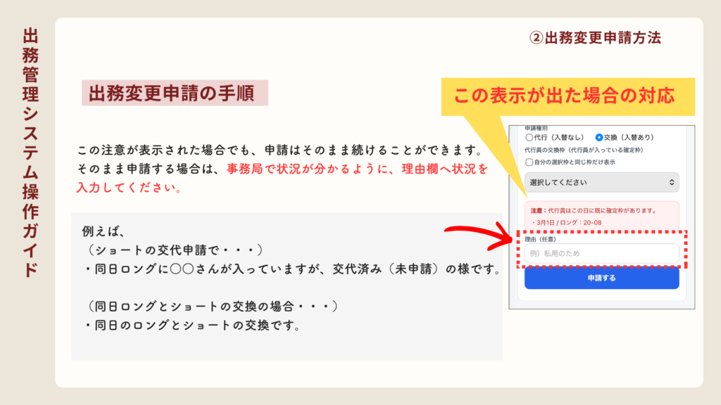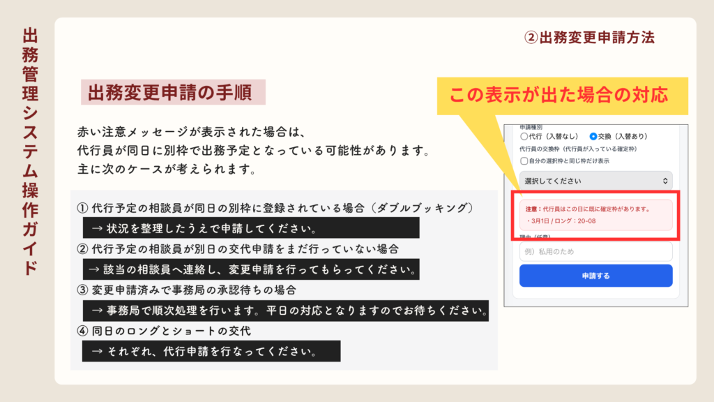出務交代申請で、「注意」が出た時の申請方法について、補足のスライドを1枚追加しました。